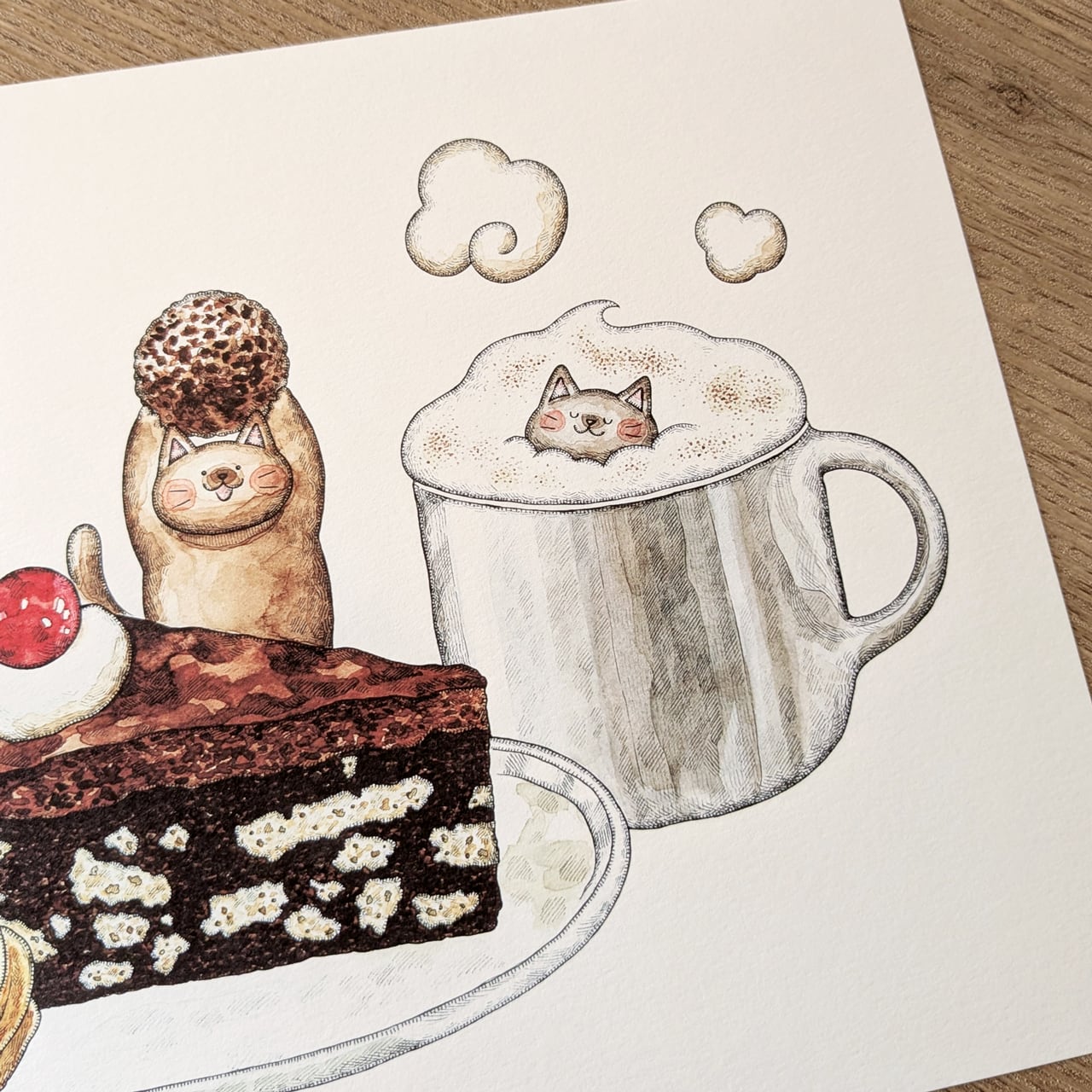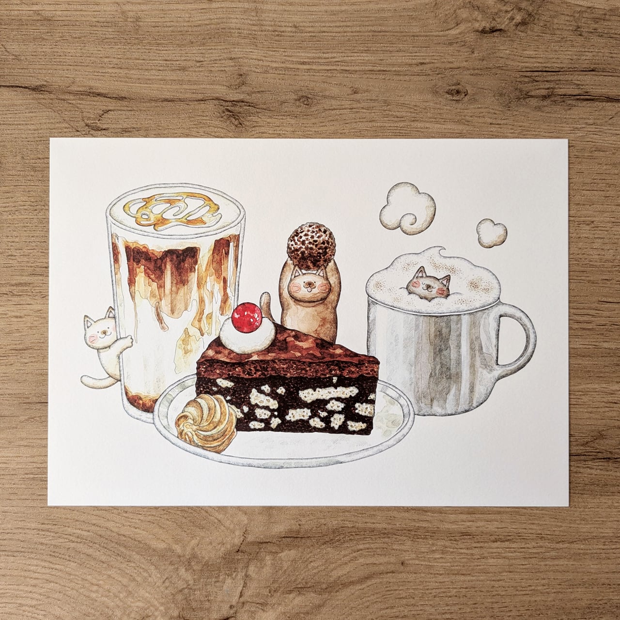 手描きイラスト アートプリント ポスターインテリア 猫 ねこ ネコ 水彩 ほっこり 絵画 コーヒー お菓子 スイーツ 喫茶店 カフェ 癒し レトロ アンティーク 可愛い クッキー キャラメルマキアート カフェラテ ケーキ