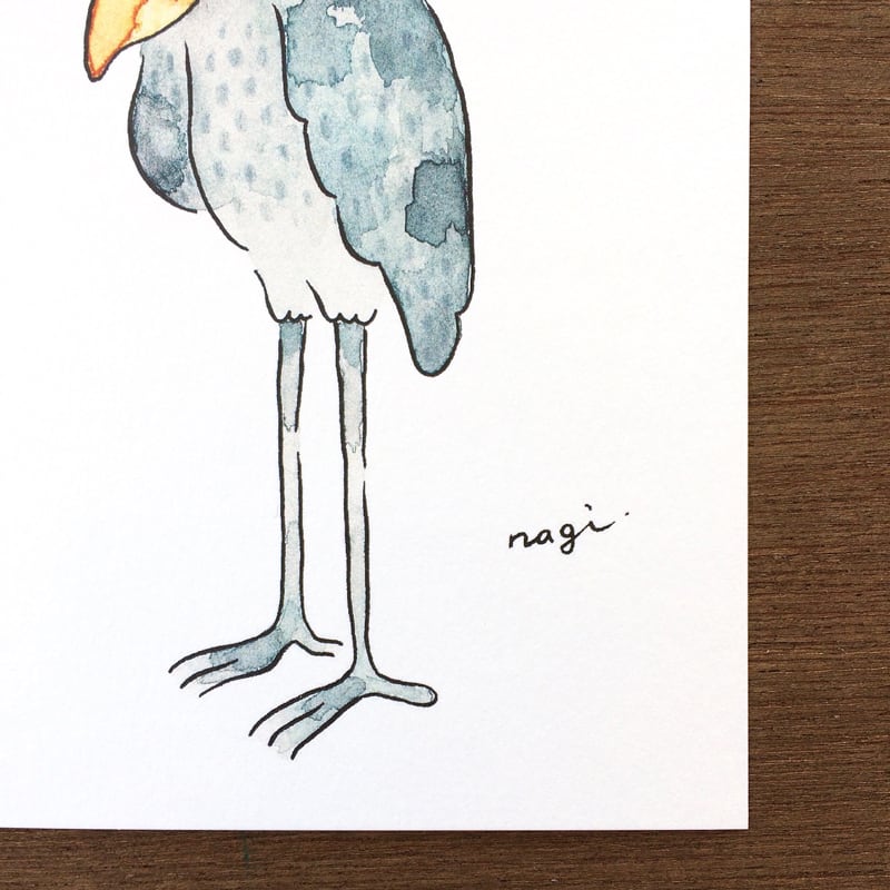 Gペンのラインと、水彩の染みた色が味わい深いハシビロコウさんのイラスト。目つきがキリっとカッコイイ鳥さんです。