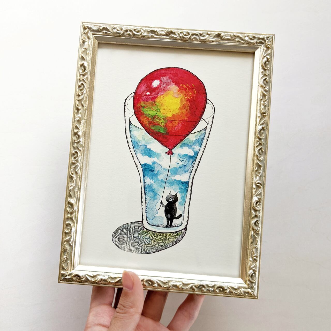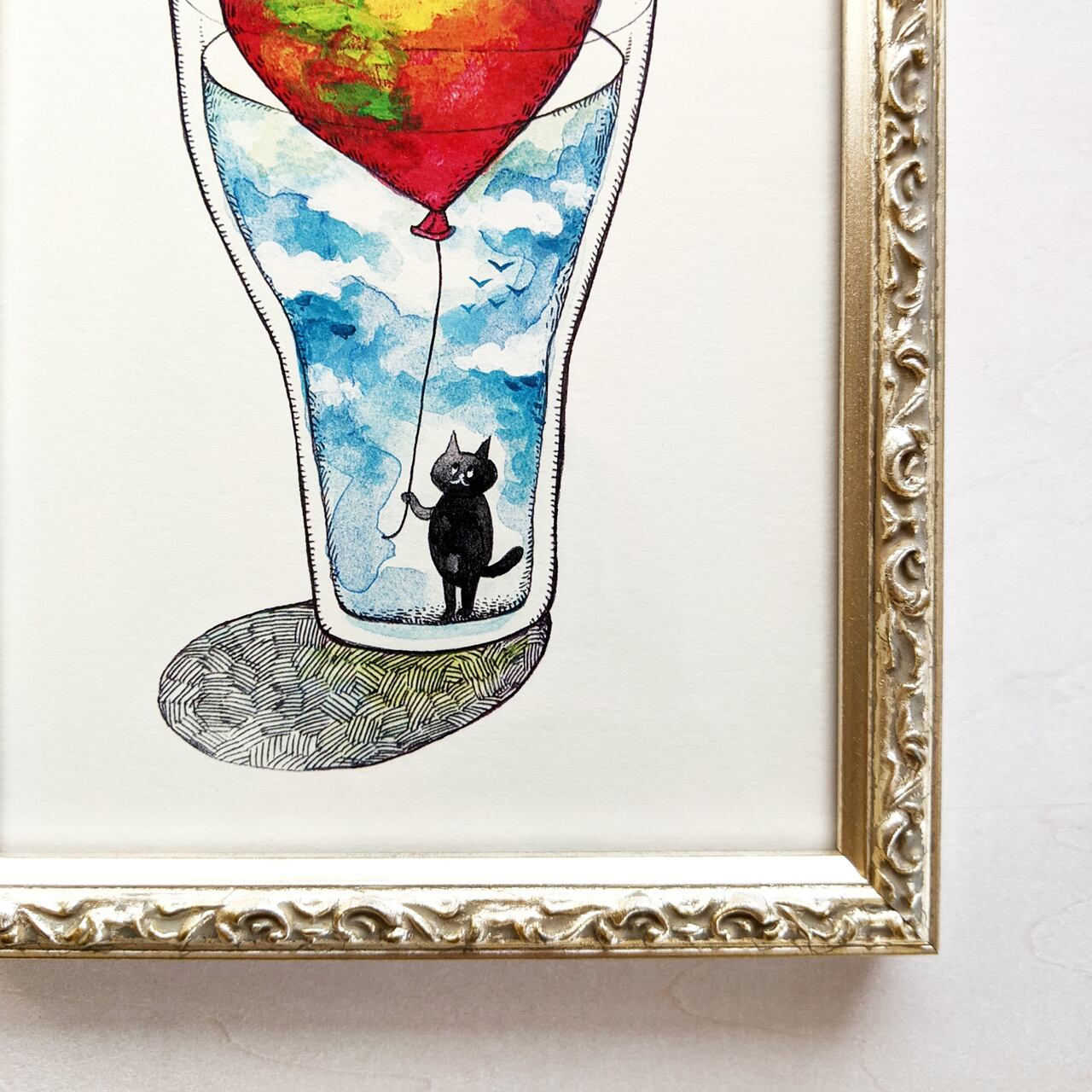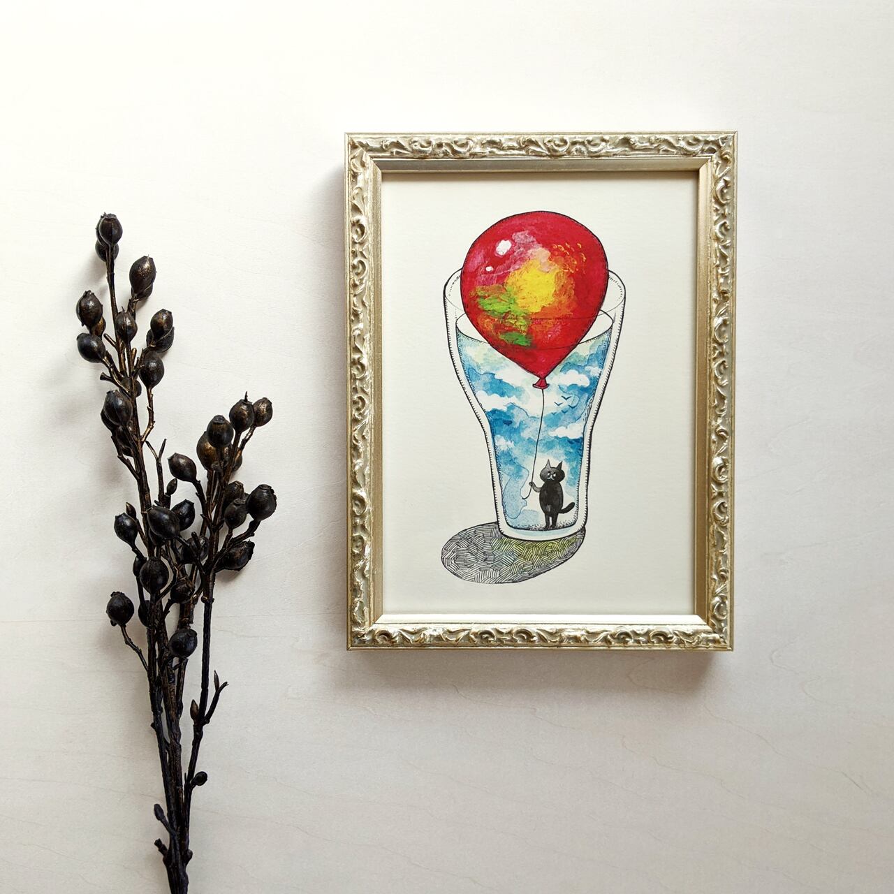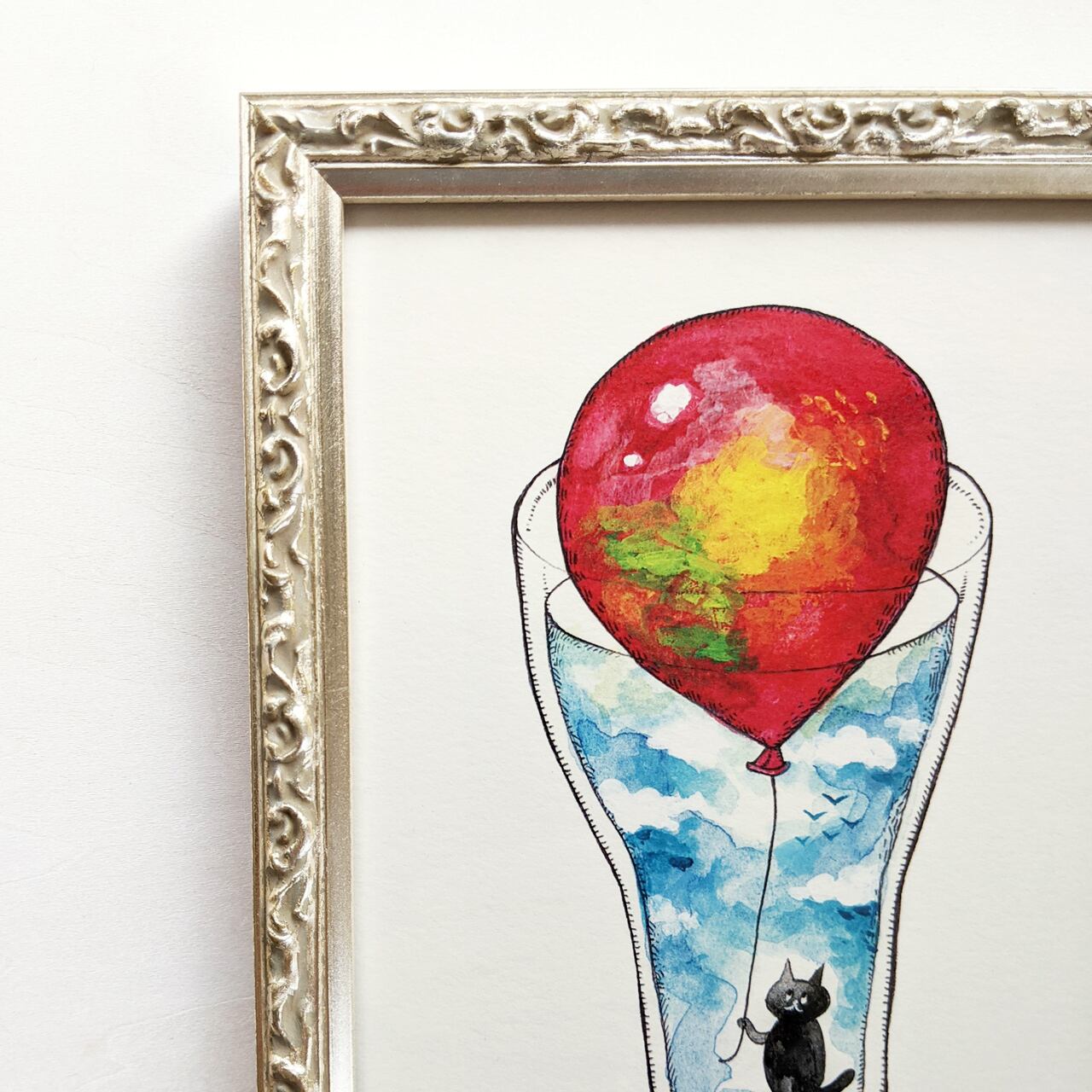 コップの中に入った黒猫と風船のイラストです。絵本の1ページのようなアートプリント。