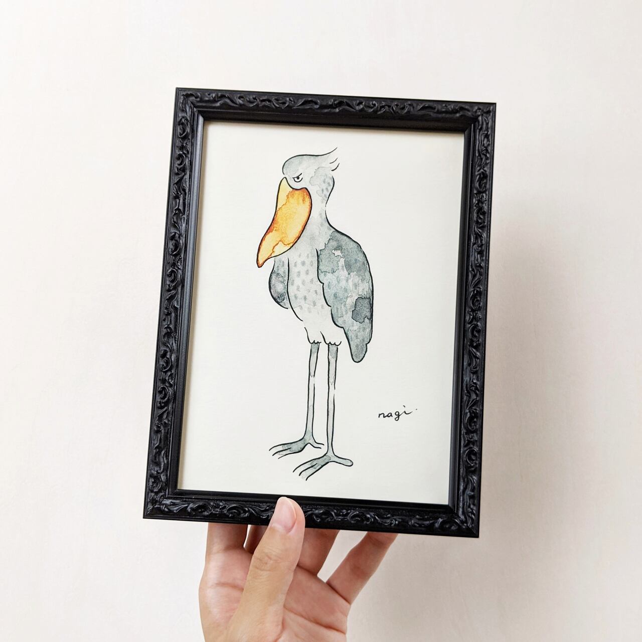 ハシビロコウ 鳥 手描きイラスト ポスター 記念日 誕生日プレゼント ミニインテリア 動物 アートプリント 水彩 シンプル おしゃれ