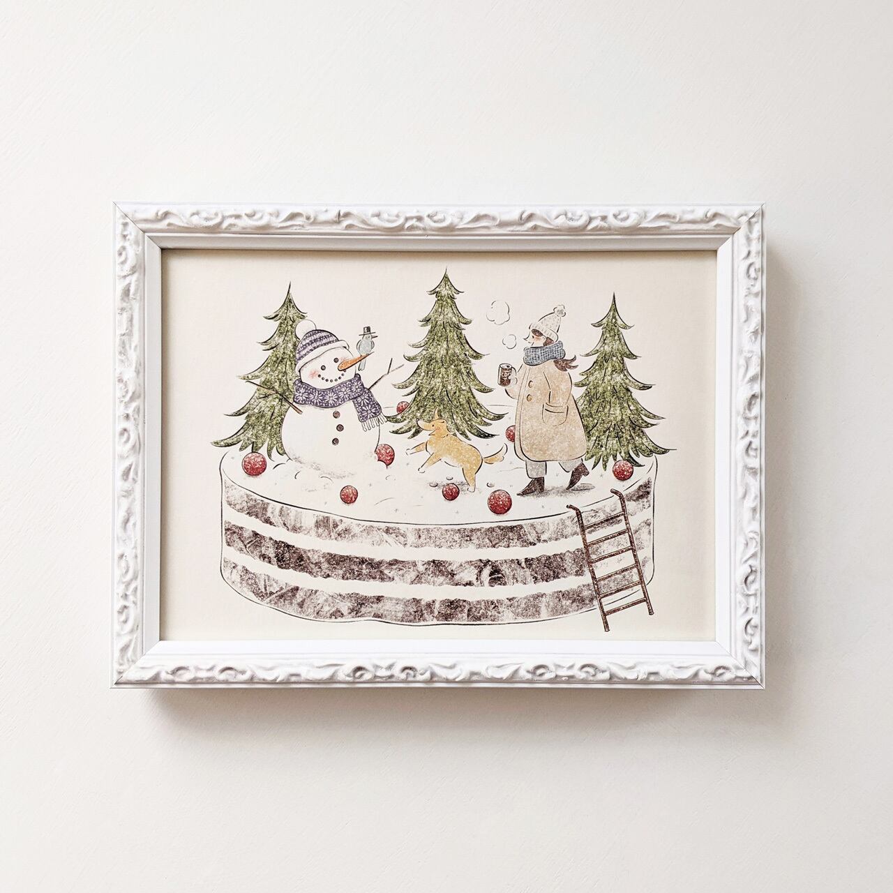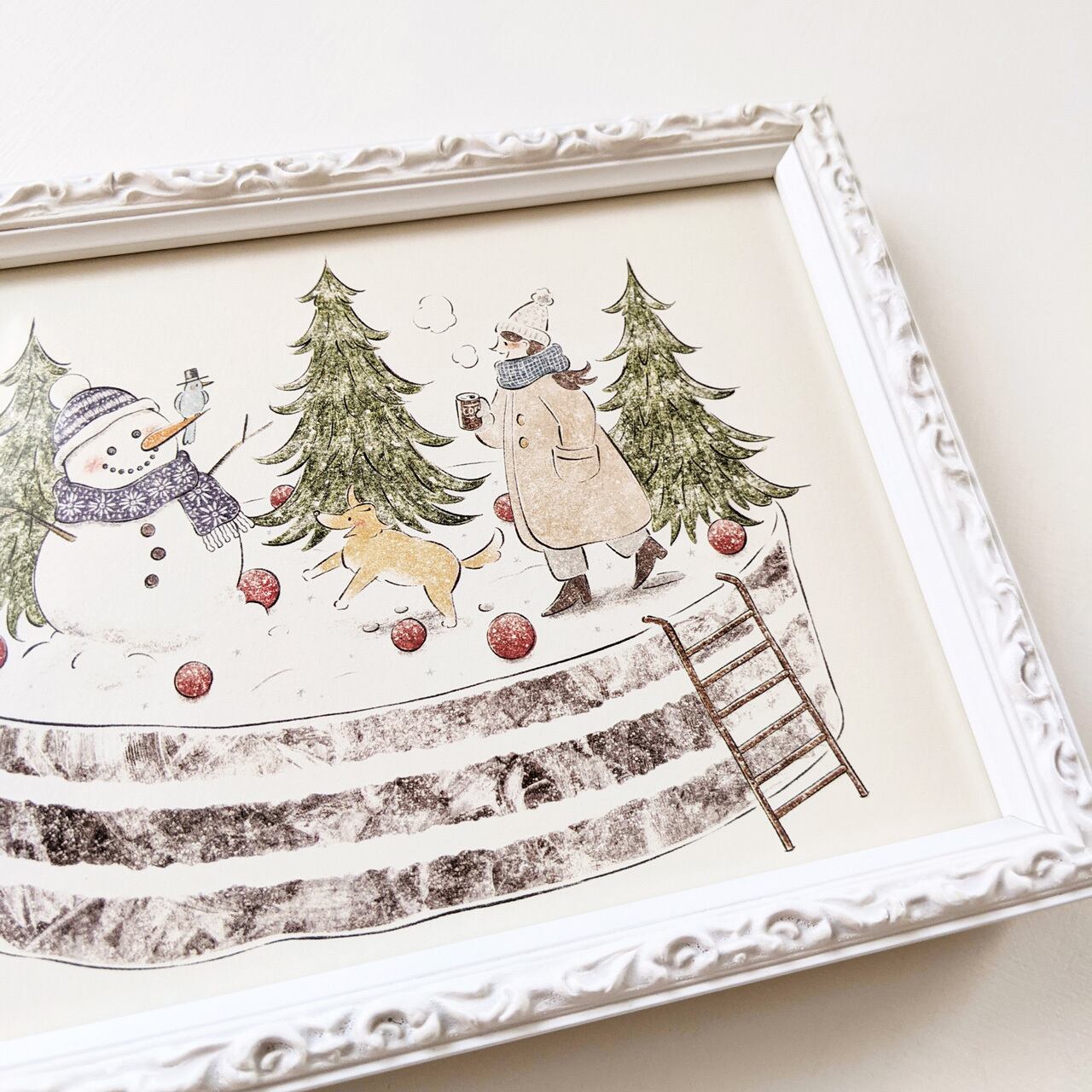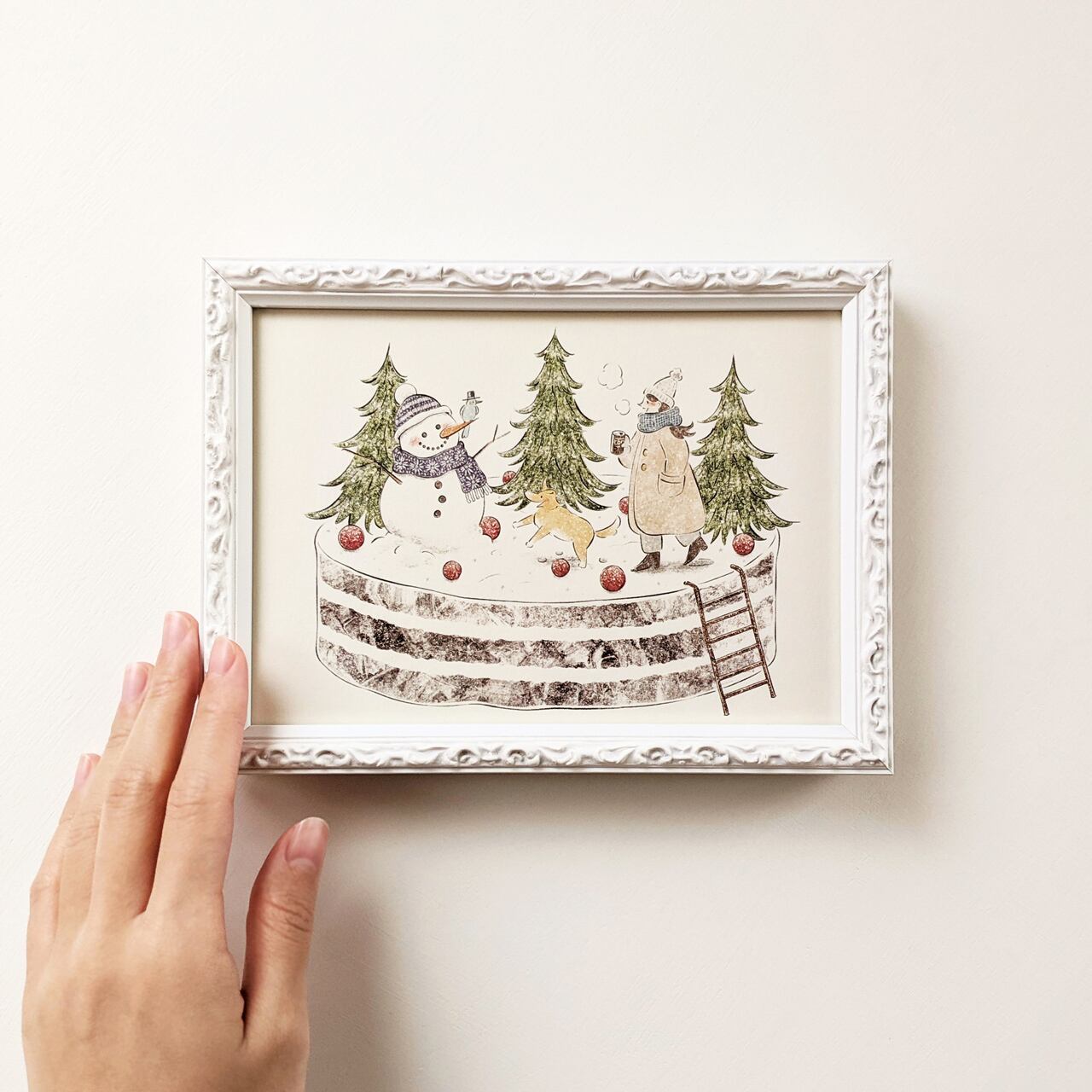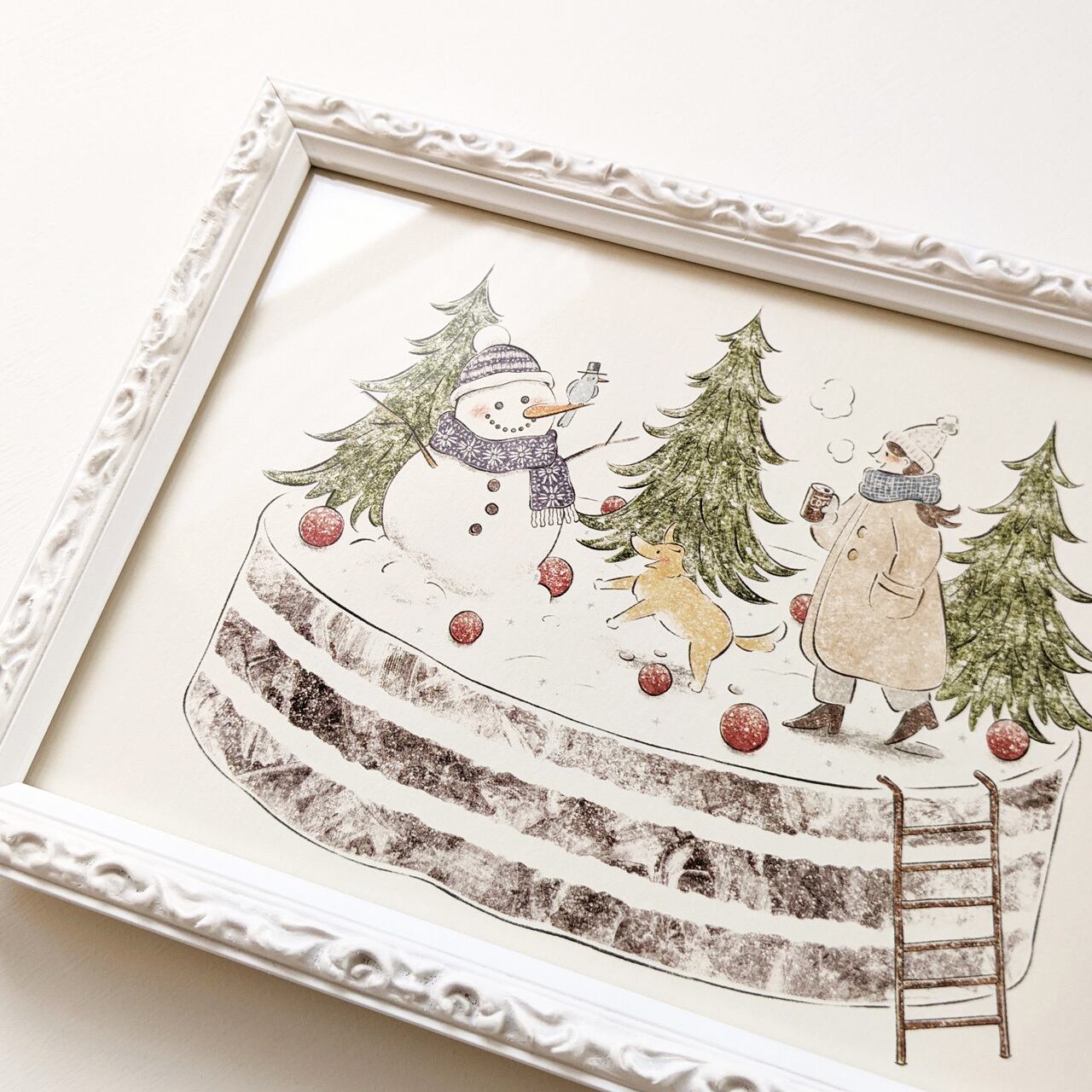 真っ白な雪が降り積もった、冬のケーキのアートプリントです。モミの木も砂糖漬けのチェリーも、雪で冬の色に染まっています。さむい季節特有の澄んだ空気感と、ほっこりとしたぬくもりを感じられる作品です。