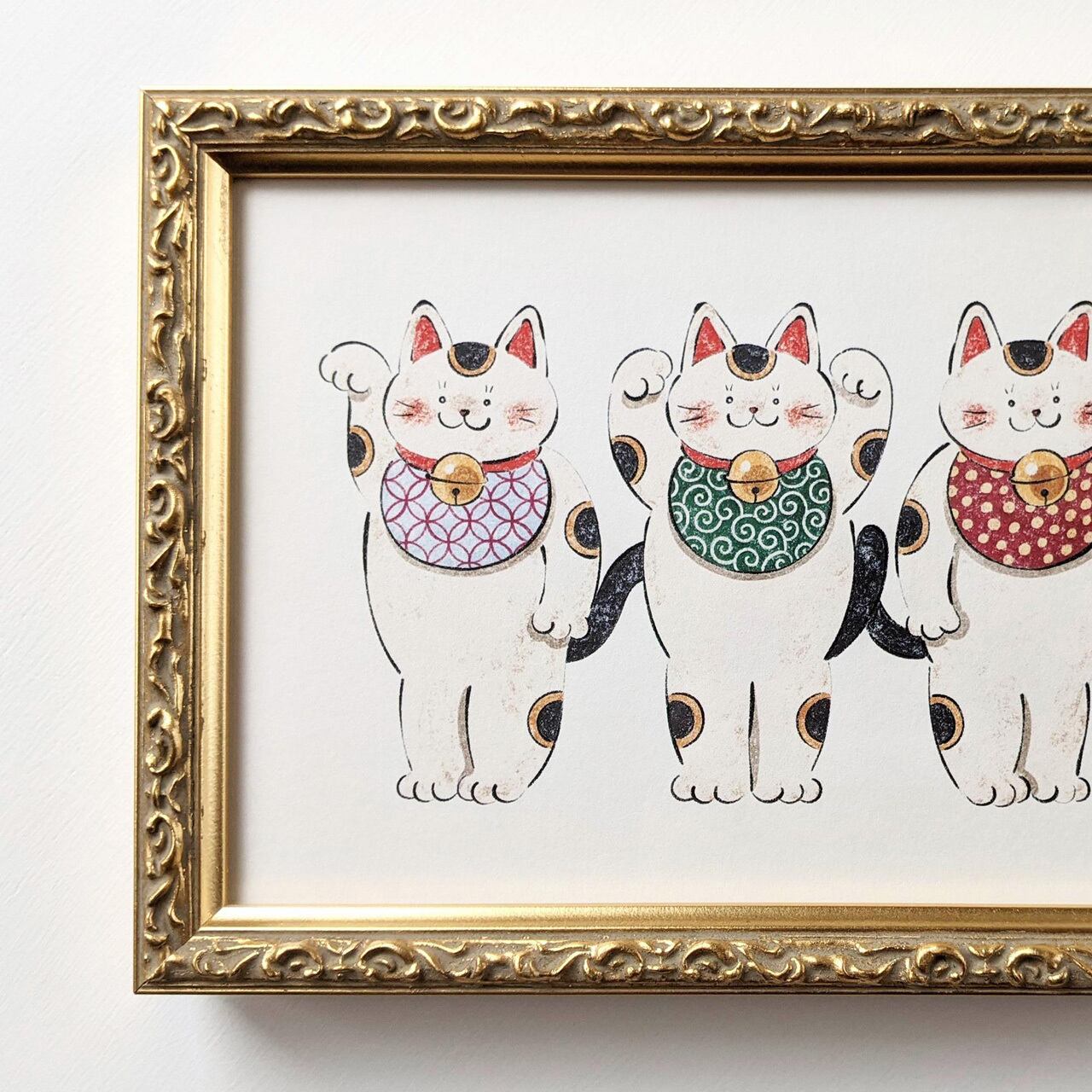 お好みのフレームに入れて飾れば、気軽にお部屋の雰囲気変えを楽しむことが出来ます。猫好きな方へのギフトにもおすすめです。縁起の良いモチーフですので、開店祝いや引っ越し祝いにもおすすめです。