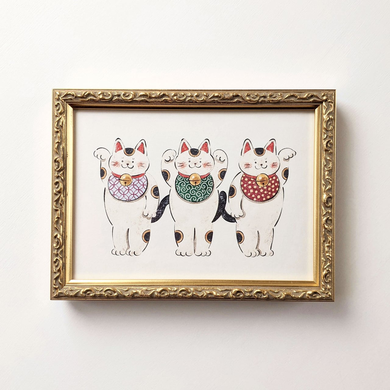 三種の招き猫が総出で福を招いてくれるイラストアートプリントです。