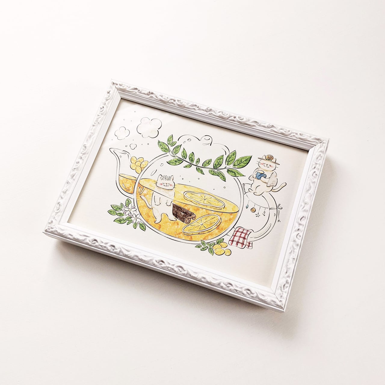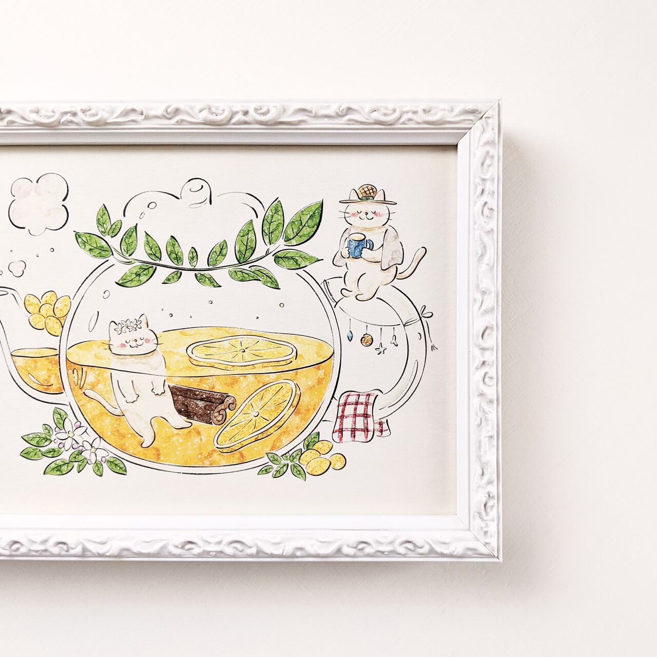 手描きイラスト ポスター 記念日 誕生日プレゼント ミニインテリア 動物 アートプリント おしゃれ 猫 紅茶 レモンティー リラックス カフェ