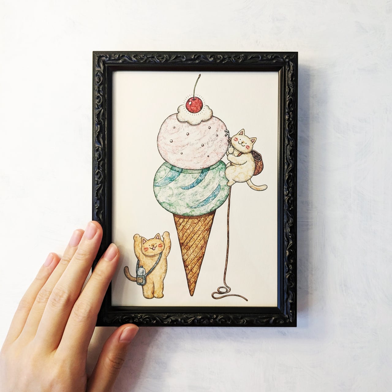 手描きイラスト アートプリント ポスター インテリア 癒し 絵画 猫 ねこ ネコ 可愛い ギフト 誕生日プレゼント 模様替え 壁掛け ナチュラル 癒し アイスクリーム スイーツ アンティーク