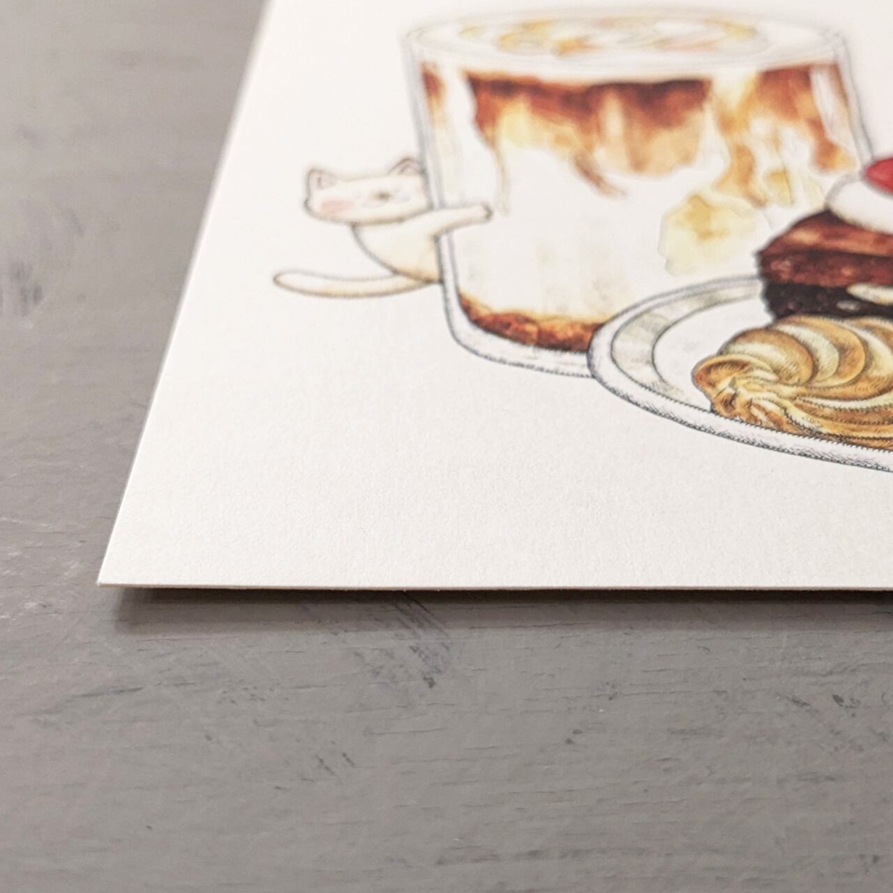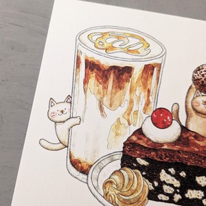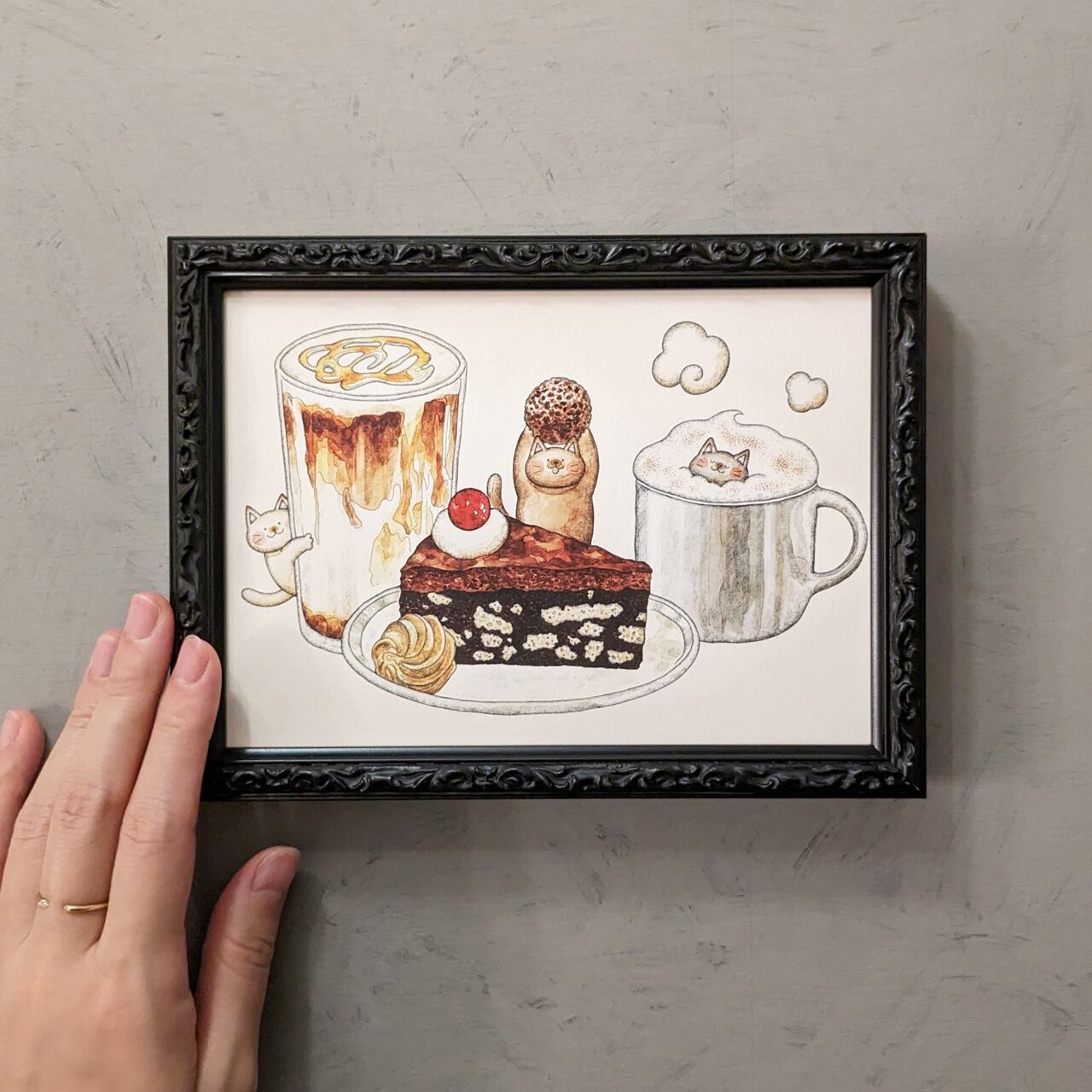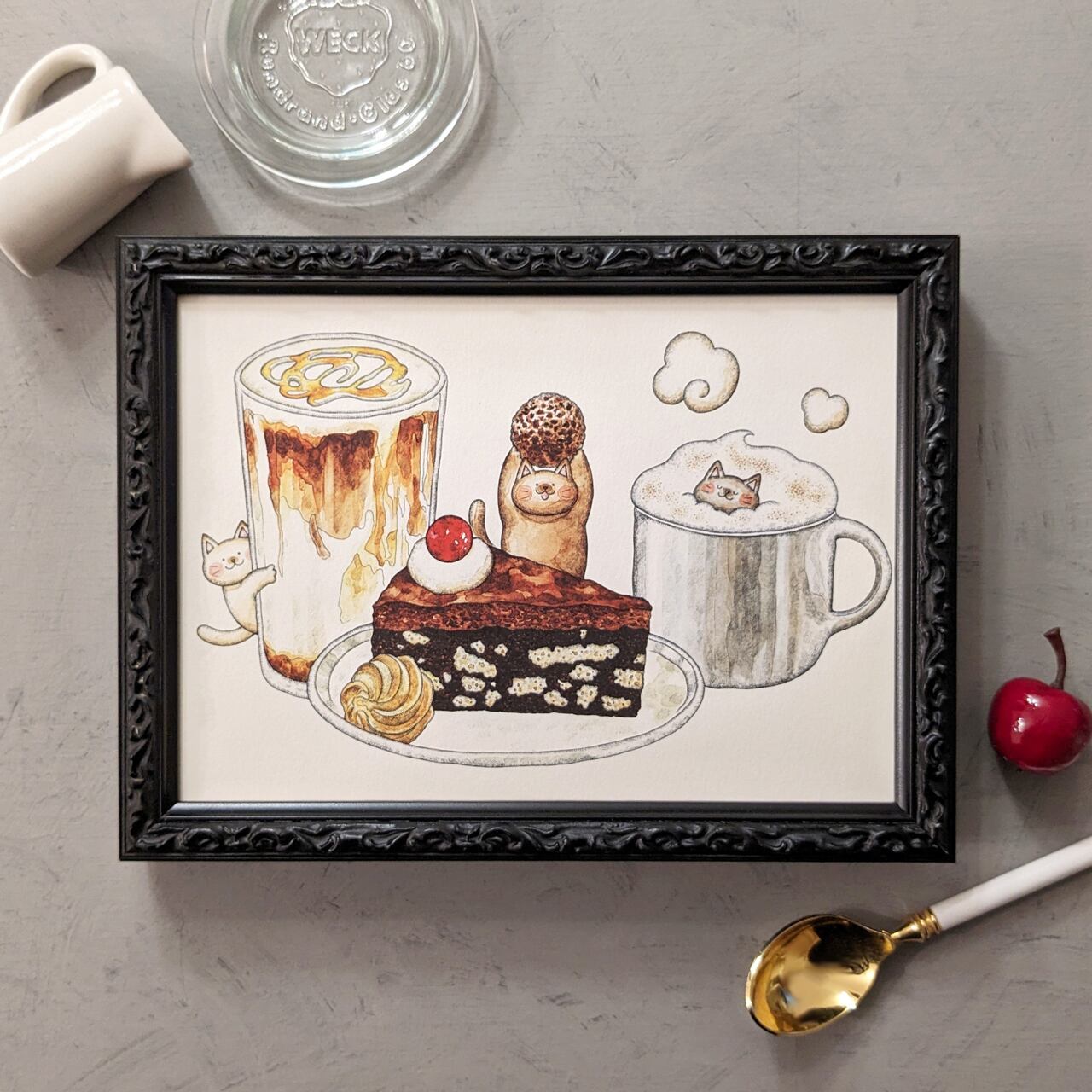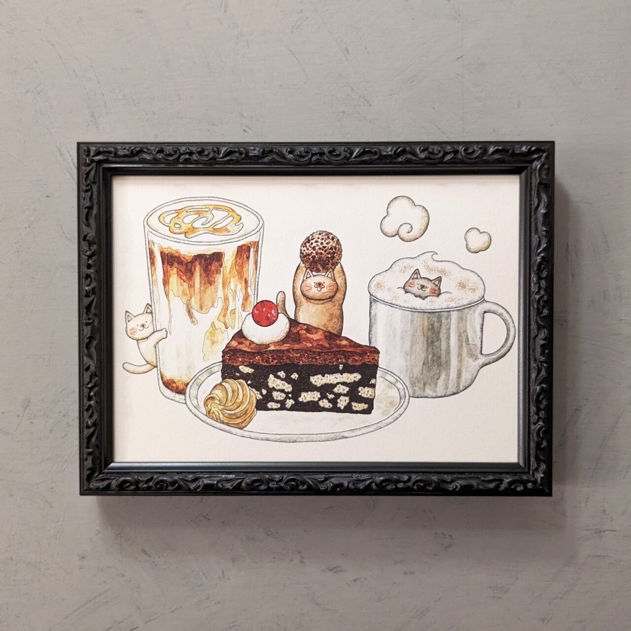 手描きイラスト アートプリント ポスターインテリア 猫 ねこ ネコ 水彩 ほっこり 絵画 コーヒー お菓子 スイーツ 喫茶店 カフェ 癒し レトロ アンティーク 可愛い クッキー キャラメルマキアート カフェラテ ケーキ