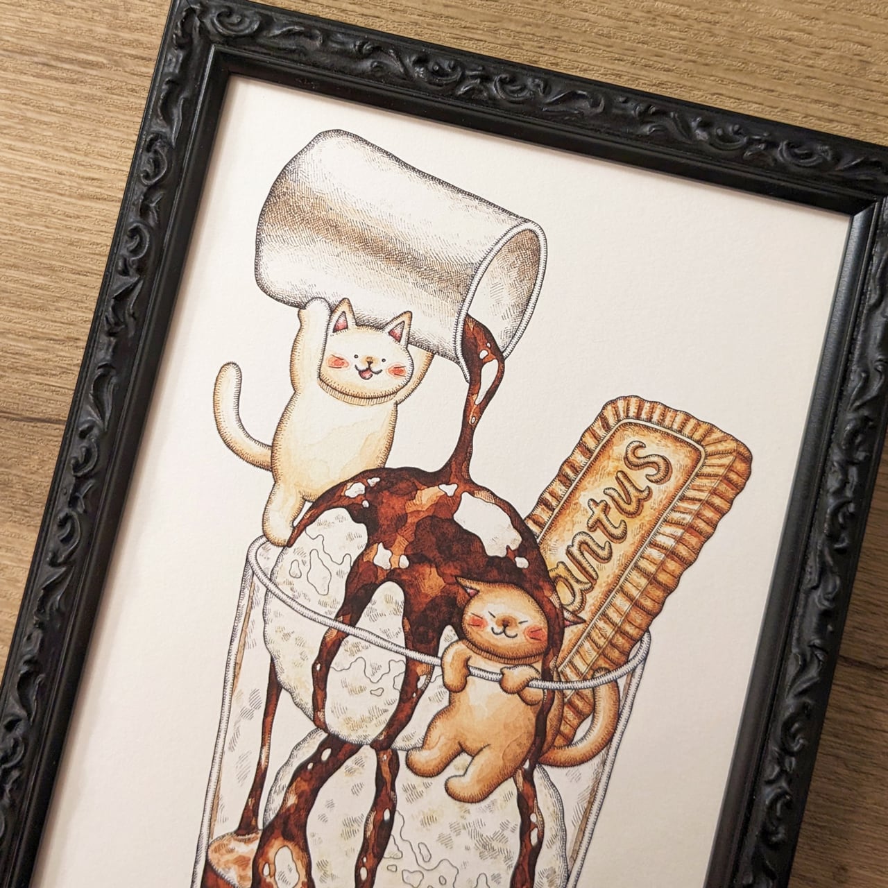 手描きイラスト アートプリント ポスター インテリア 癒し 絵画 猫 ねこ ネコ 可愛い ギフト 誕生日プレゼント ナチュラル 癒し アイスクリーム アフォガード スイーツ アンティーク コーヒー お菓子 カフェ