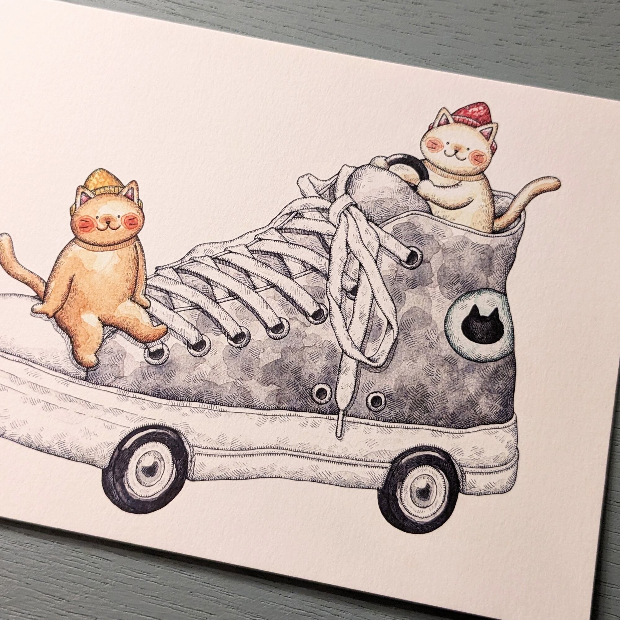 繊細なペン画と水彩の滲みが大人可愛い猫とスニーカーのイラストです。